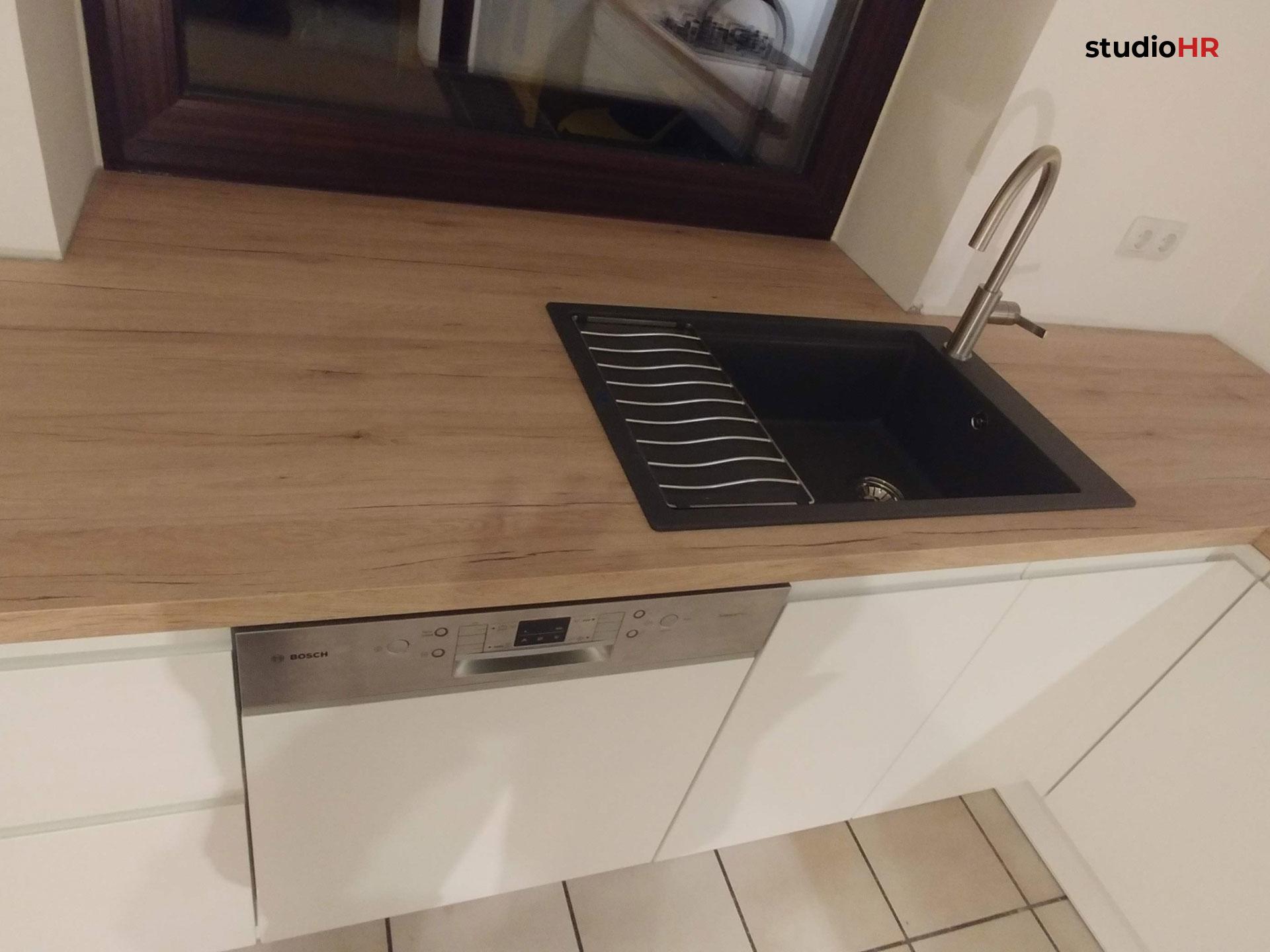 Radna ploča u toplom dekoru drveta stvara ugodan kontrast svijetlim frontama te unosi prirodnu ravnotežu u prostor. Odabrani otvoreni elementi i niše dodatno razbijaju monotoniju i doprinose osjećaju topline i domaće atmosfere.