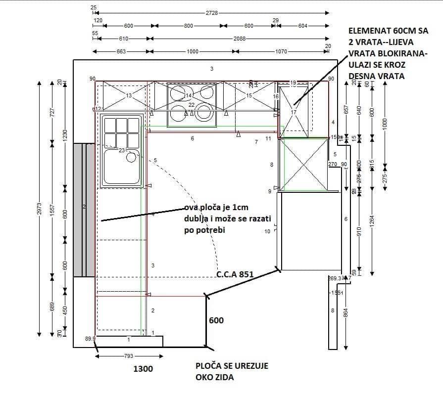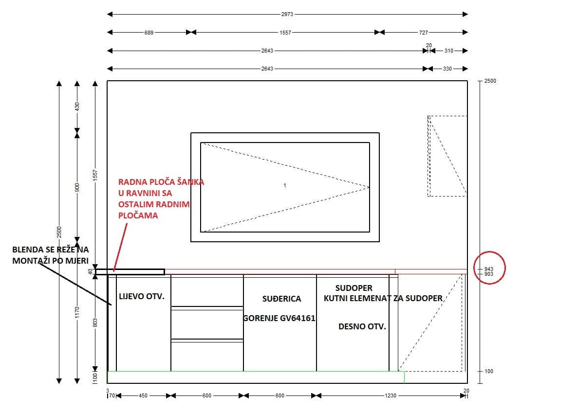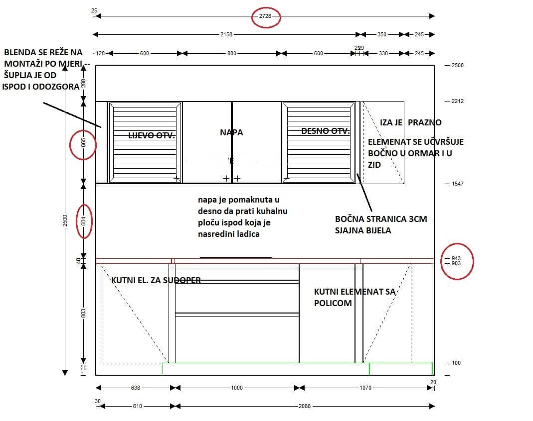 Projekt uključuje i detaljno razrađene tehničke nacrte (tlocrt i zidne razvode), koji su korišteni kao temelj za preciznu izradu i montažu kuhinje, bez kompromisa u funkcionalnosti.