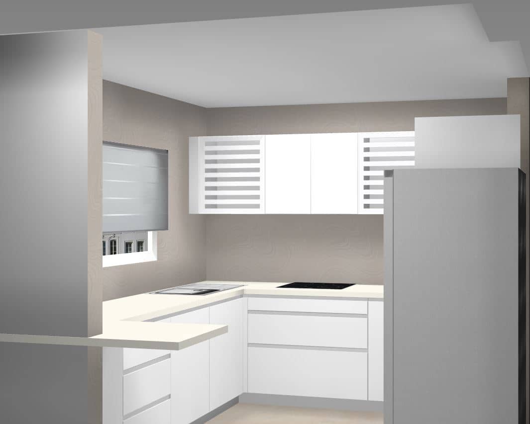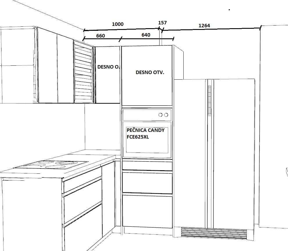 Projekt je osmišljen tako da maksimalno iskoristi dostupnu kvadraturu prostora, uz jasan i logičan raspored radnih zona – pripreme, kuhanja, pranja i pohrane. L-raspored kuhinje omogućuje prirodan tijek kretanja, dobru preglednost i ugodan rad u svakodnevnoj upotrebi.