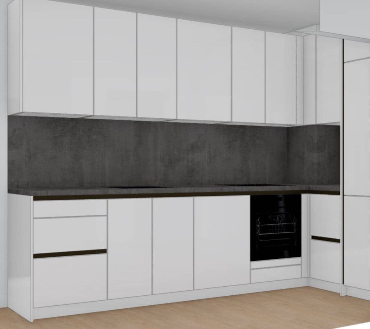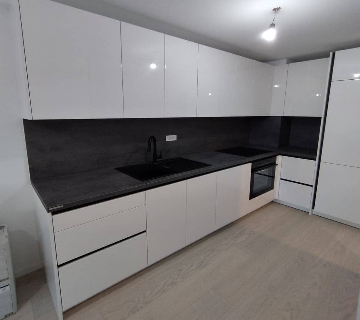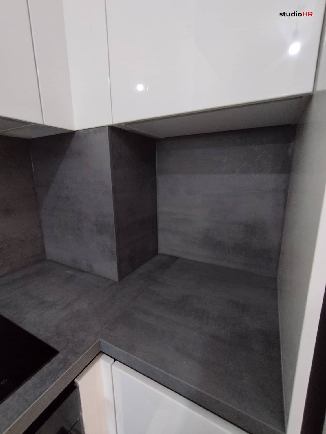 Radna ploča i zidna obloga izvedeni su u modernom tamnom dekoru koji stvara snažan kontrast bijelim frontama i daje prostoru dozu elegancije i dubine.