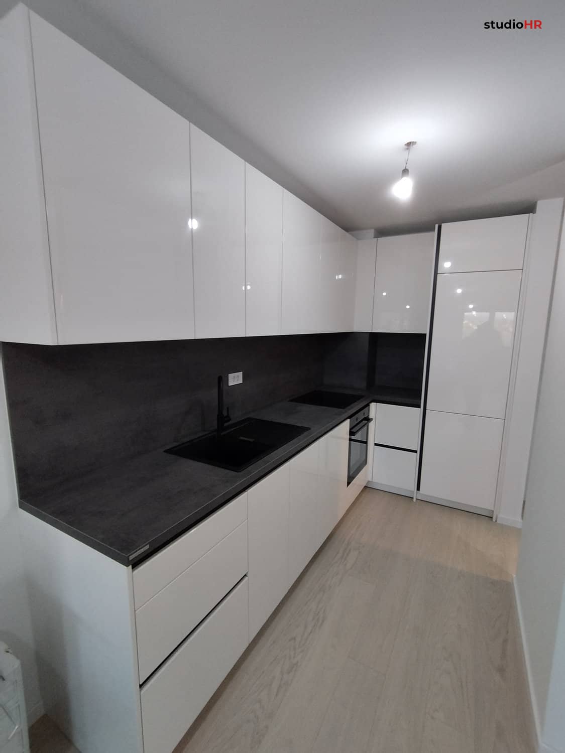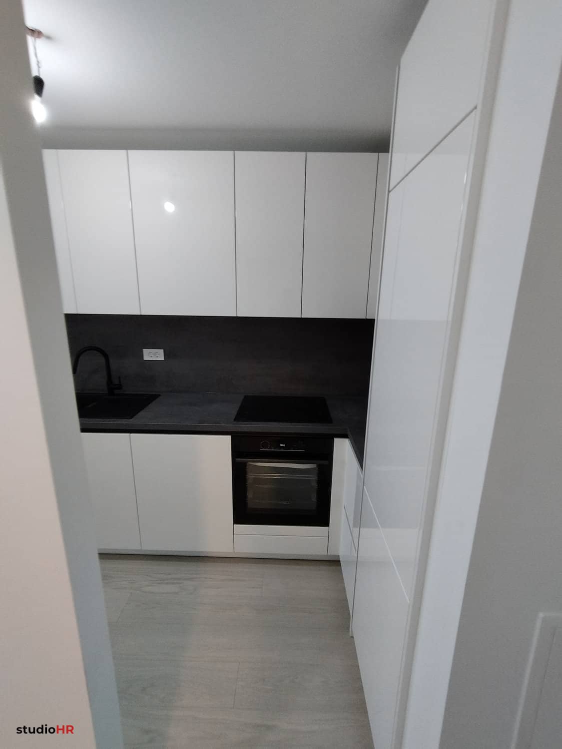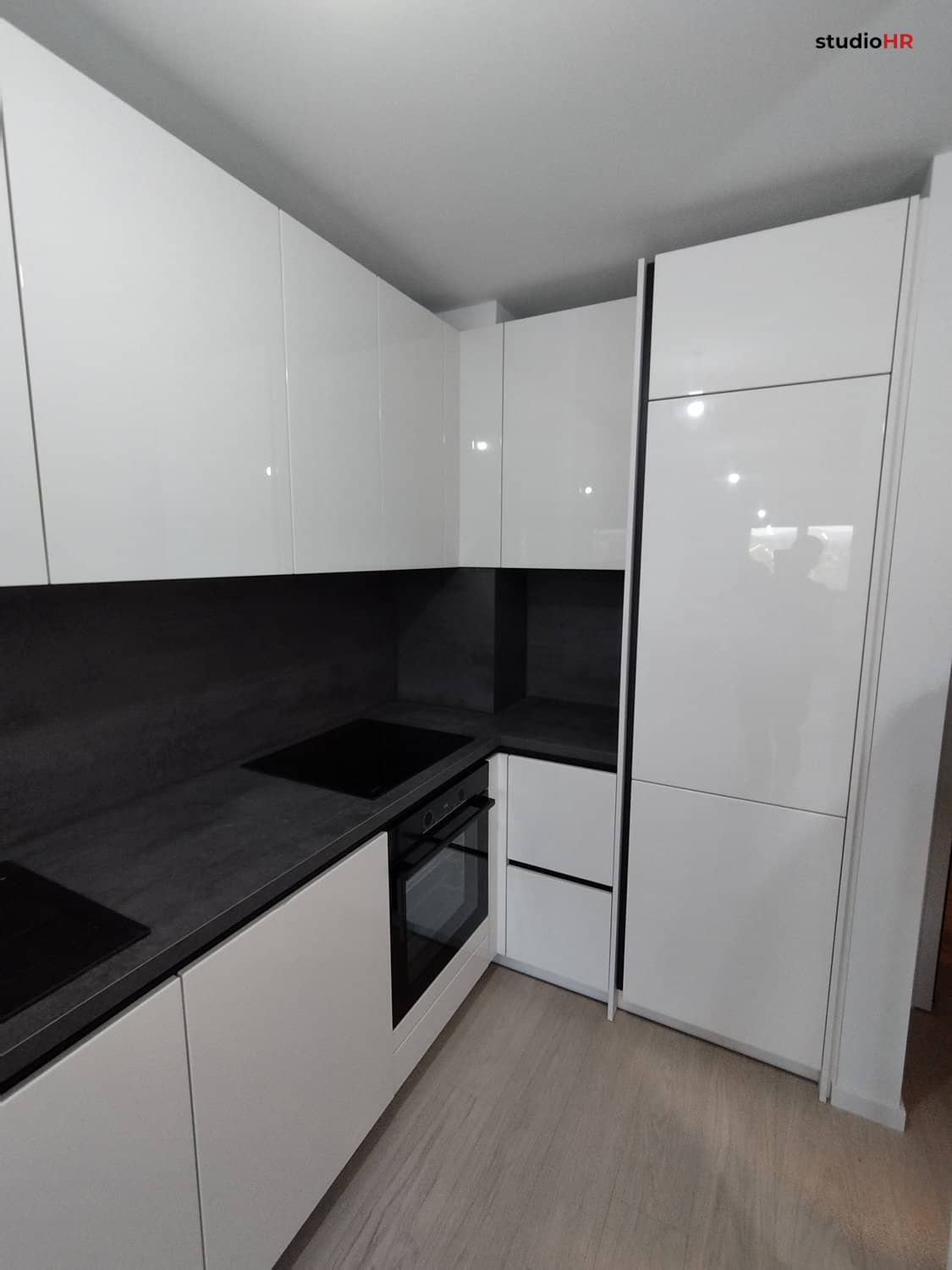Radna ploča i zidna obloga izvedeni su u modernom tamnom dekoru koji stvara snažan kontrast bijelim frontama i daje prostoru dozu elegancije i dubine.